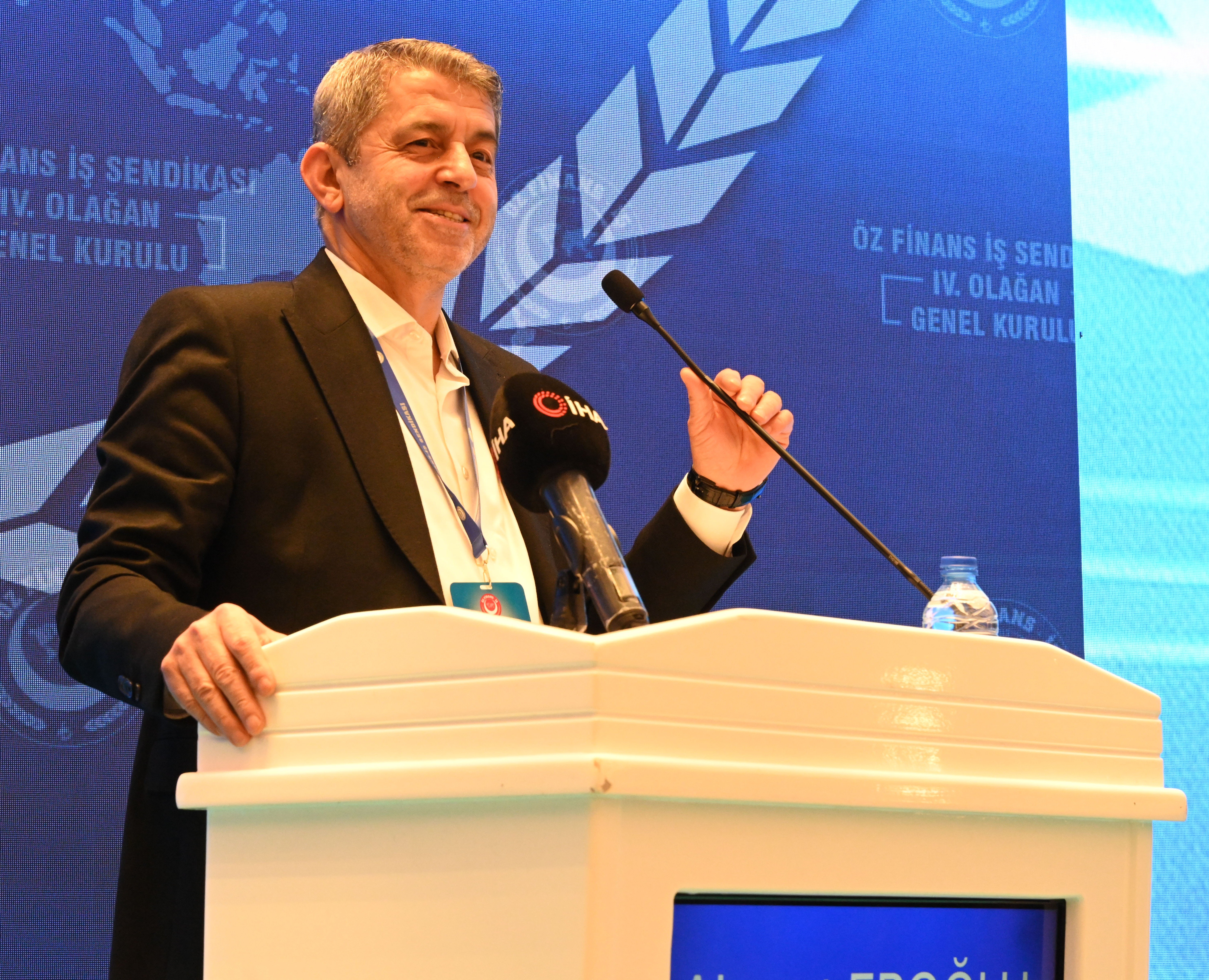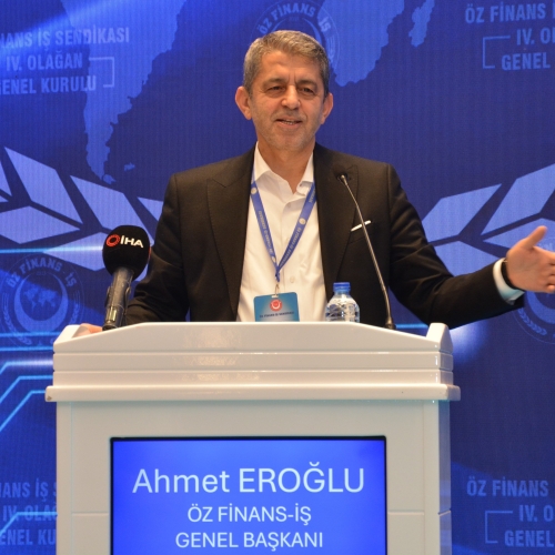 Türkiye'nin en büyük Banka ve Finans İş kolu sendikası olduklarını hatırlatan Genel Başkanımız Eroğlu, "Büyük Dağın, Karı Eksilmez Ve Soğuğu Da Serttir. Büyük Olmanın Sorumluluğu Da Büyüktür. Büyük Olmakla, Öne Geçmekle, Çıtayı Da Yükseltmiş Olursunuz.Yerinizde Sayamazsanız, Duraklama Yapamazsınız, Daha Fazla Çalışmak, Daha Hızlı Koşmak Zorundasınız. Bütün Gözler Üzerinizdeyse, Beklentiler Yükselmeye Başlamışsa, Artık Duramazsınız. Biz De Sorumluluklarımızın Farkındayız. Biz Artık Sadece Yetkili Olduğumuz Bankalar Ve Kurumlarda Çalışan Arkadaşlarımız İçin Değil, Neredeyse Bütün Sektör Çalışanları İçin Güzel İşlere İmza Atan Bir Sendika Haline Geldik. Bizim İmzaladığımız Toplu İş Sözleşmeleri Ve Aldığımız Güzel Sonuçlar, Yetkili Sendikası Olmayan Diğer Banka Çalışanları İçin De, Diğer Bankalar İçin De Kazanımlar Doğurmaya Başladı. Bu Durum Bizi Fazlasıyla Mutlu Eden Bir Olaydır Elbette. Öz Finans İş Sendikasının Kazanımları Sektöre Işık Tutar Hale Gelmiştir.Bu Da Bizim Üzerimizdeki Sorumluluğu Daha Fazla Hissetmemize Vesile Olmaktadır."