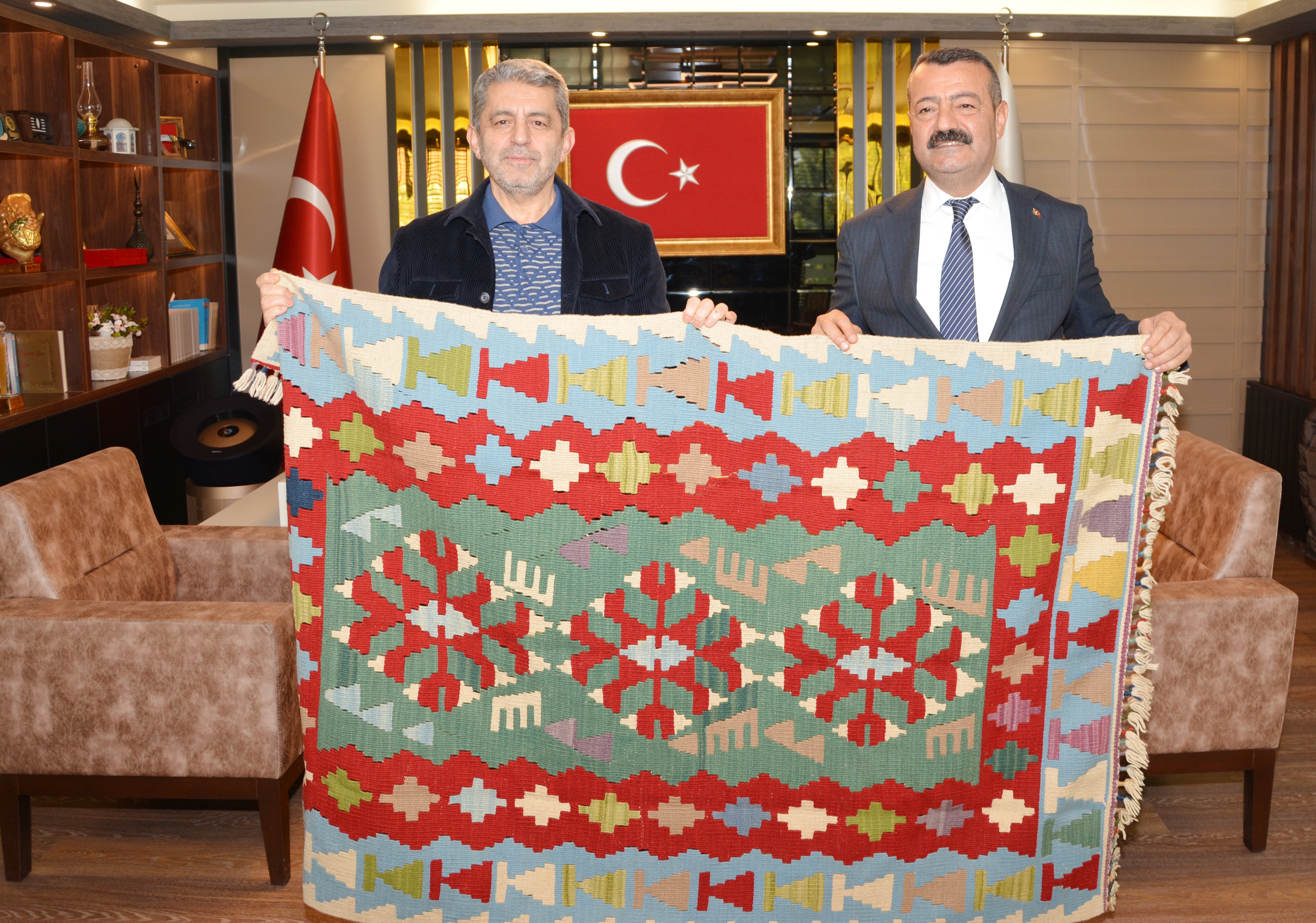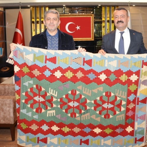 Belediye Başkanı Aksoy, Genel Başkanımız Eroğlu'na, yöreye özgü kilim hediye etti.